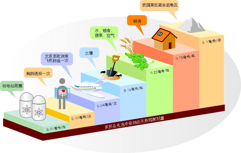 人類時(shí)刻都在經(jīng)受著各類天然射線的照射,如宇宙射線,存在于土壤、巖石、水和大氣中的鈾-238、鈾-235、钚-232、鉀-40等,這些天然射線的照射就是天然本底輻射。