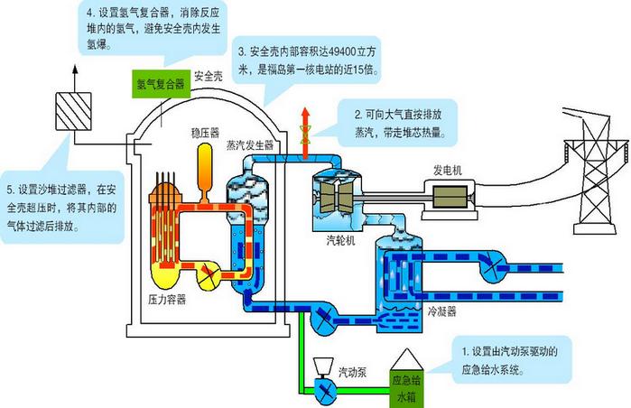 1.堆芯不會失去冷卻。機組即使失去全部廠內(nèi)外電源,也能通過自帶的氣動給水泵和蒸汽排放的形式維持對堆芯的冷卻。此外,還額外設(shè)置第五臺柴油機,全廠失電的風險進一步降低。