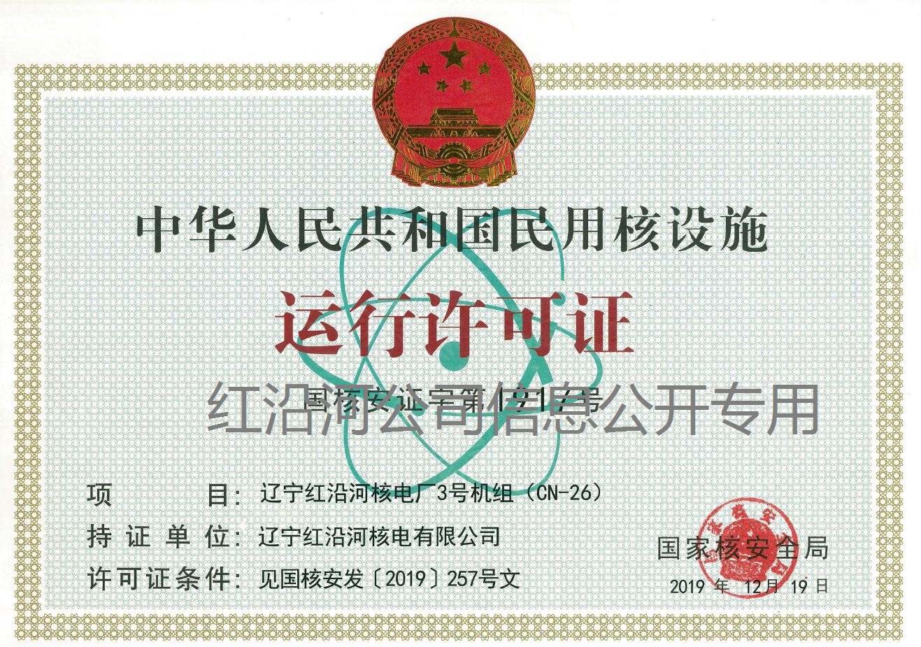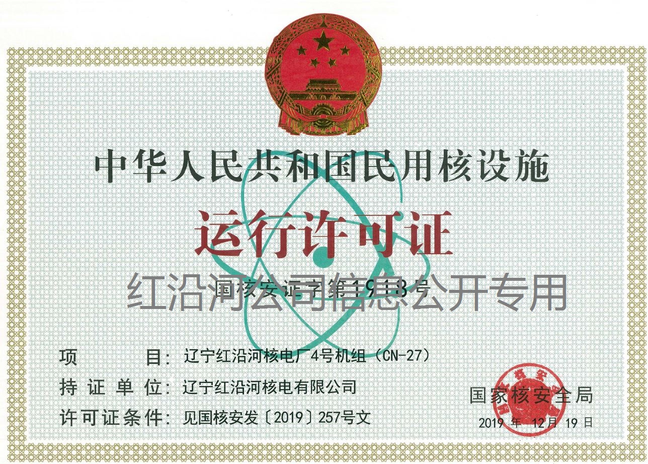 遼寧紅沿河核電廠三、四號機(jī)組運(yùn)行許可證已于2019年12月19日獲得。