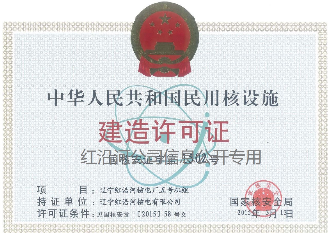 2015 年3月13日,國家核安全局向公司頒發(fā)了遼寧紅沿河核電廠五、六號機(jī)組建造許可證。